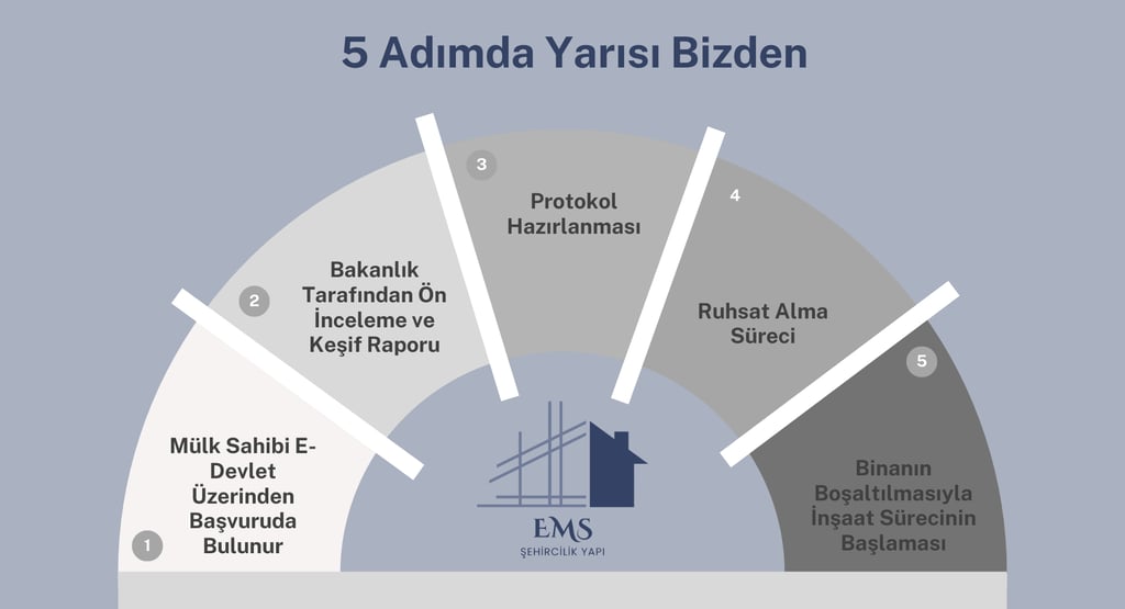 Devlet destekli "Yarısı Bizden" kampanyası, riskli yapıların kentsel dönüşüm sürecini hızlandırmak ve mülk sahiplerini ekonomik olarak desteklemek amacıyla hayata geçirilmiş güçlü bir teşviktir. Bu kampanya kapsamında, yenilenecek olan binanızın dönüşüm maliyetinin yarısı devlet tarafından karşılanmaktadır.