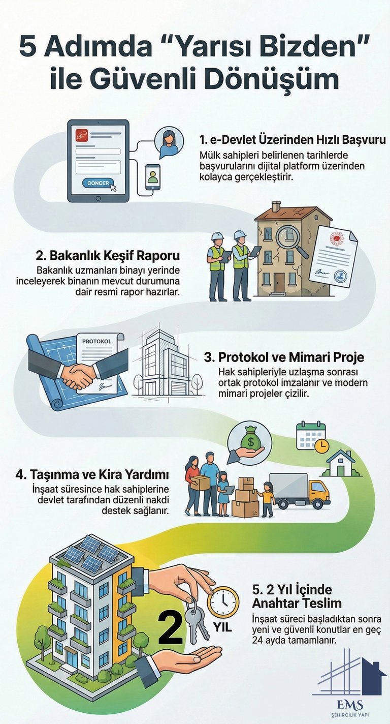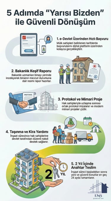 Devlet destekli "Yarısı Bizden" kampanyası, riskli yapıların kentsel dönüşüm sürecini hızlandırmak ve mülk sahiplerini ekonomik olarak desteklemek amacıyla hayata geçirilmiş güçlü bir teşviktir. Bu kampanya kapsamında, yenilenecek olan binanızın dönüşüm maliyetinin yarısı devlet tarafından karşılanmaktadır.